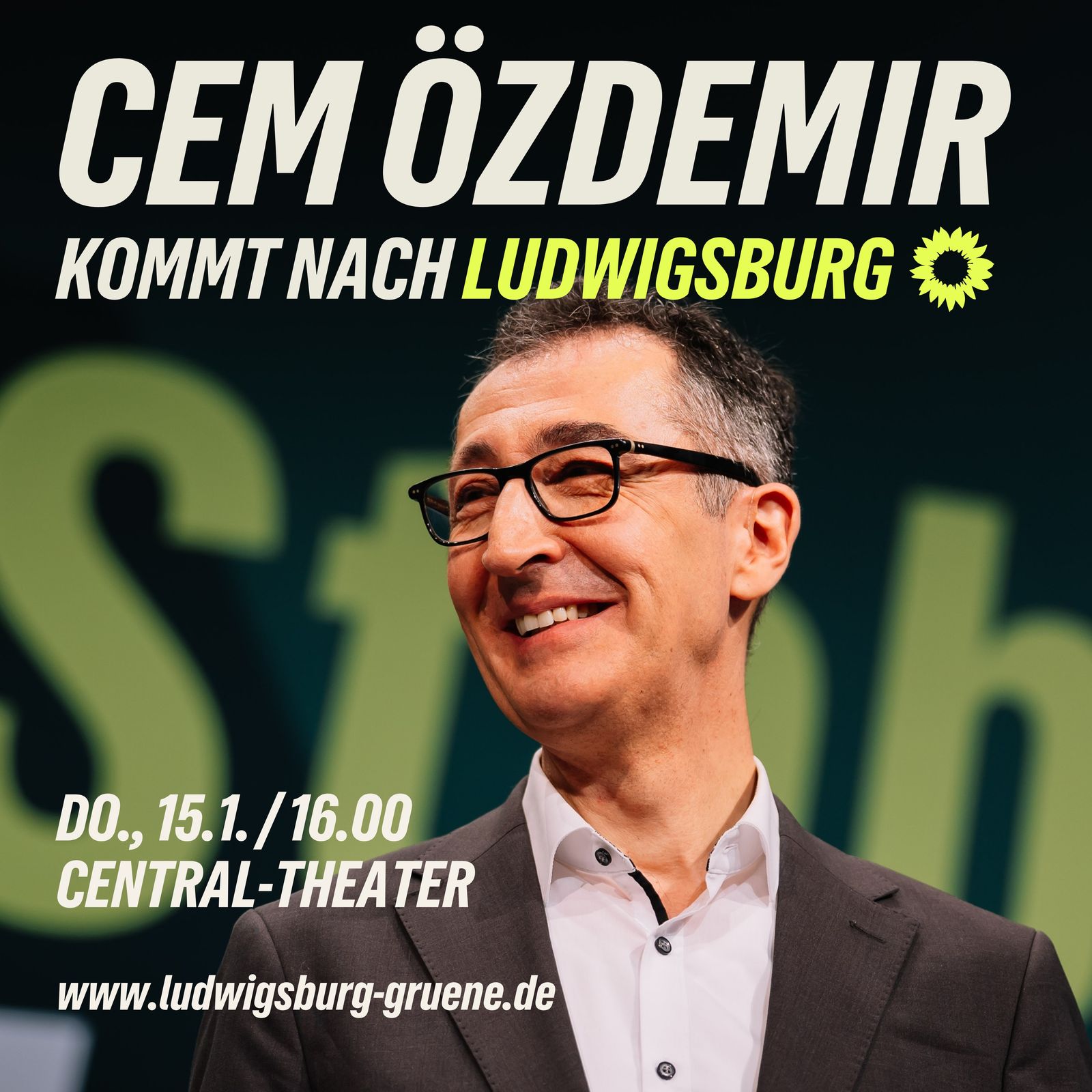 Gemeinsam mit unseren Kandidierenden zur Landtagswahl Meike Günter, Silke Gericke und Tayfun Tok laden wir Euch ein zum Wahlkampfauftakt mit Cem Özdemir am Donnerstag, 15. Januar 2026 um 16 Uhr im CENTRAL THEATER, Arsenalstraße 4 in Ludwigsburg.
