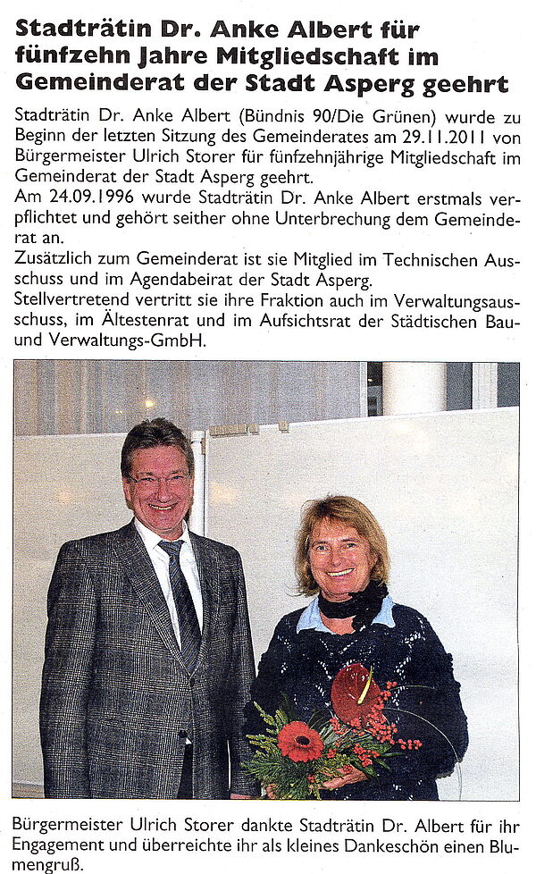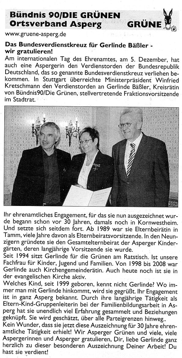 Nach dem Ausscheiden von Elly Martinat aus dem Gemeinderat der Stadt Asperg wurde Stadträtin Gerlinde Bäßler zur neuen ersten ehrenamtlichen stellvertretenden Bürgermeisterin bestellt. Als einzige Kandidatin erhielt sie mit zwölf Stimmen gleich im ersten Wahlgang die hierfür erforderliche Mehrheit von mehr als der Hälfte der Stimmen von Stadträten und Bürgermeister Ulrich Storer.