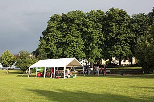 Am Samstag war das Wetter nämlich super. Sonnenschein, nicht zu heiß, leichte Brise, ein paar harmlose Wolken. Und so nahm der Flohmarkt seinen bekannten, schönen Gang. Die Besucher strömten, die Händler (nur Private) verkauften. Der Ortsverband sorgte für kühle Getränke und heiße Rote. 200 Rote, 100 Weißwürste, 100 Brezeln, Kaffee, Kuchen. Der Andrang war groß.