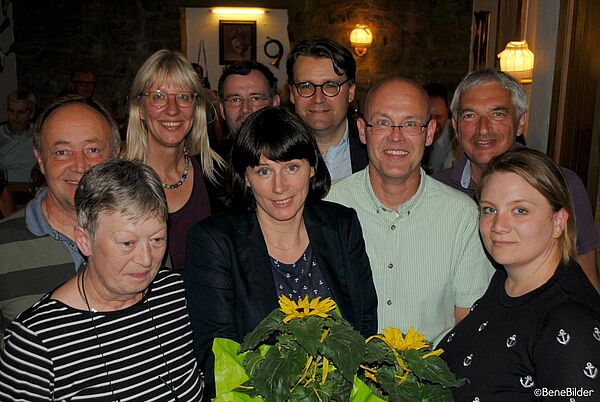 Der Kreisvorstand, die Landtagsabgeordneten Renkonen und Rößler, der Kreisgeschäftsführer, der Wahlleiter und Ingrid Hönlinger (mit Blumenstrauß)