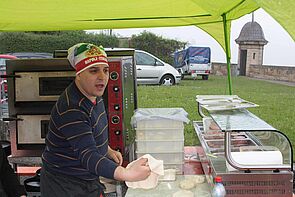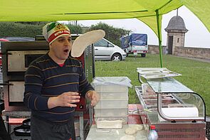 Für das Pizzabacken war der Lieferservice "Pirandello" aus Tamm verantwortlich, dessen Küchenchef den Pizzateig auf eine kunstvolle Art in die gewünschte Form brachte.