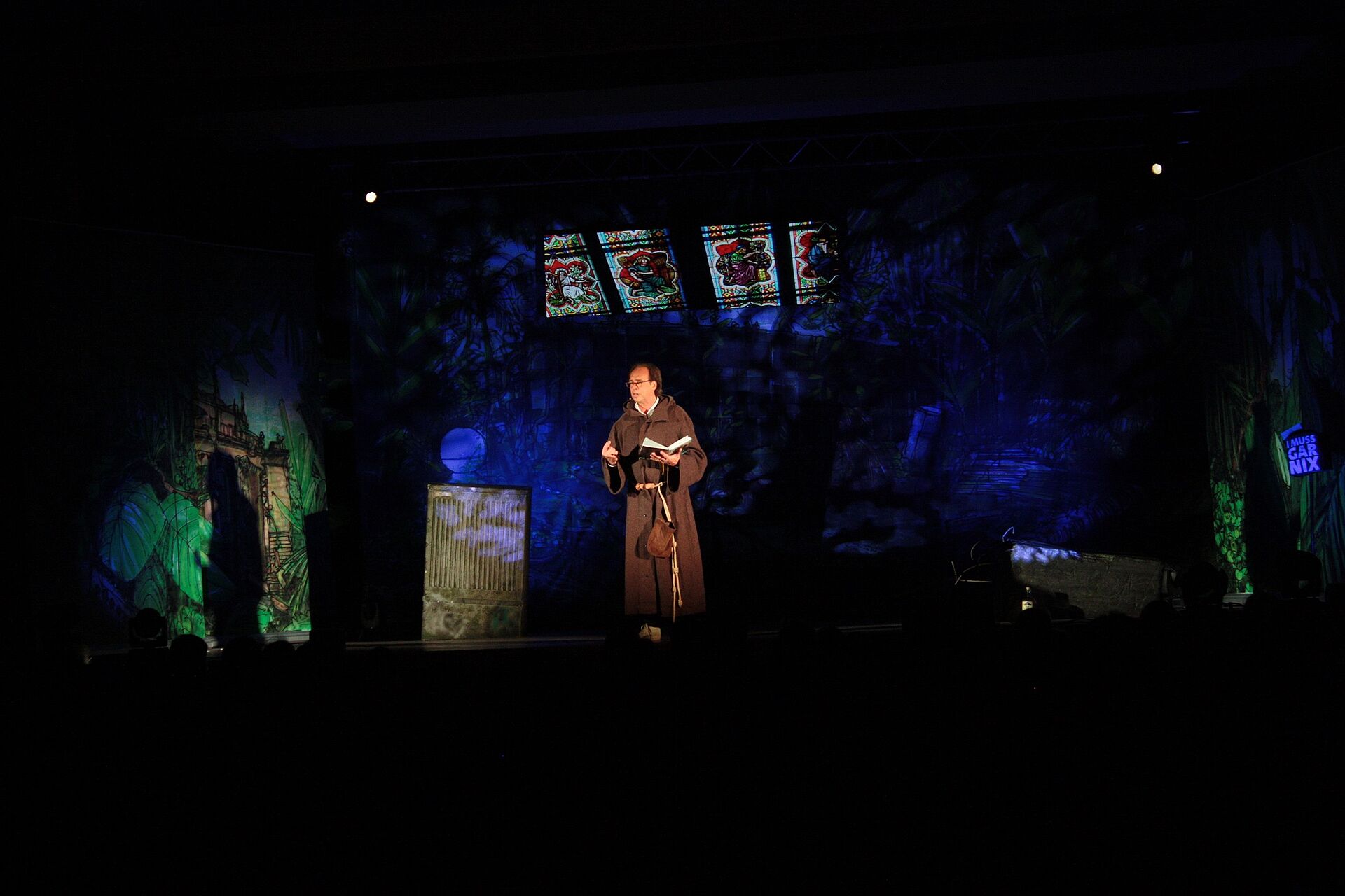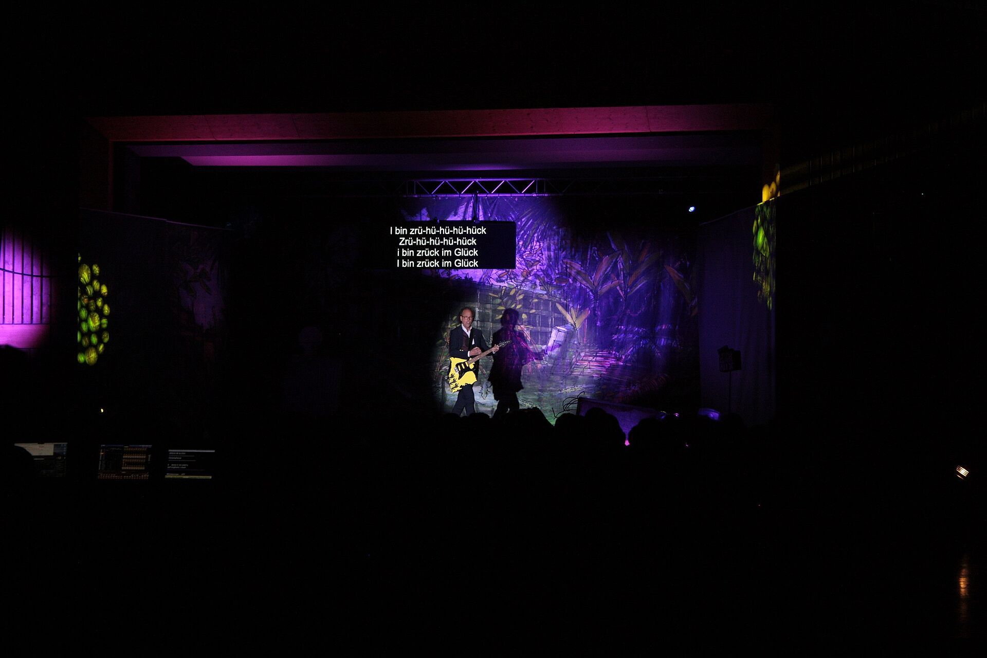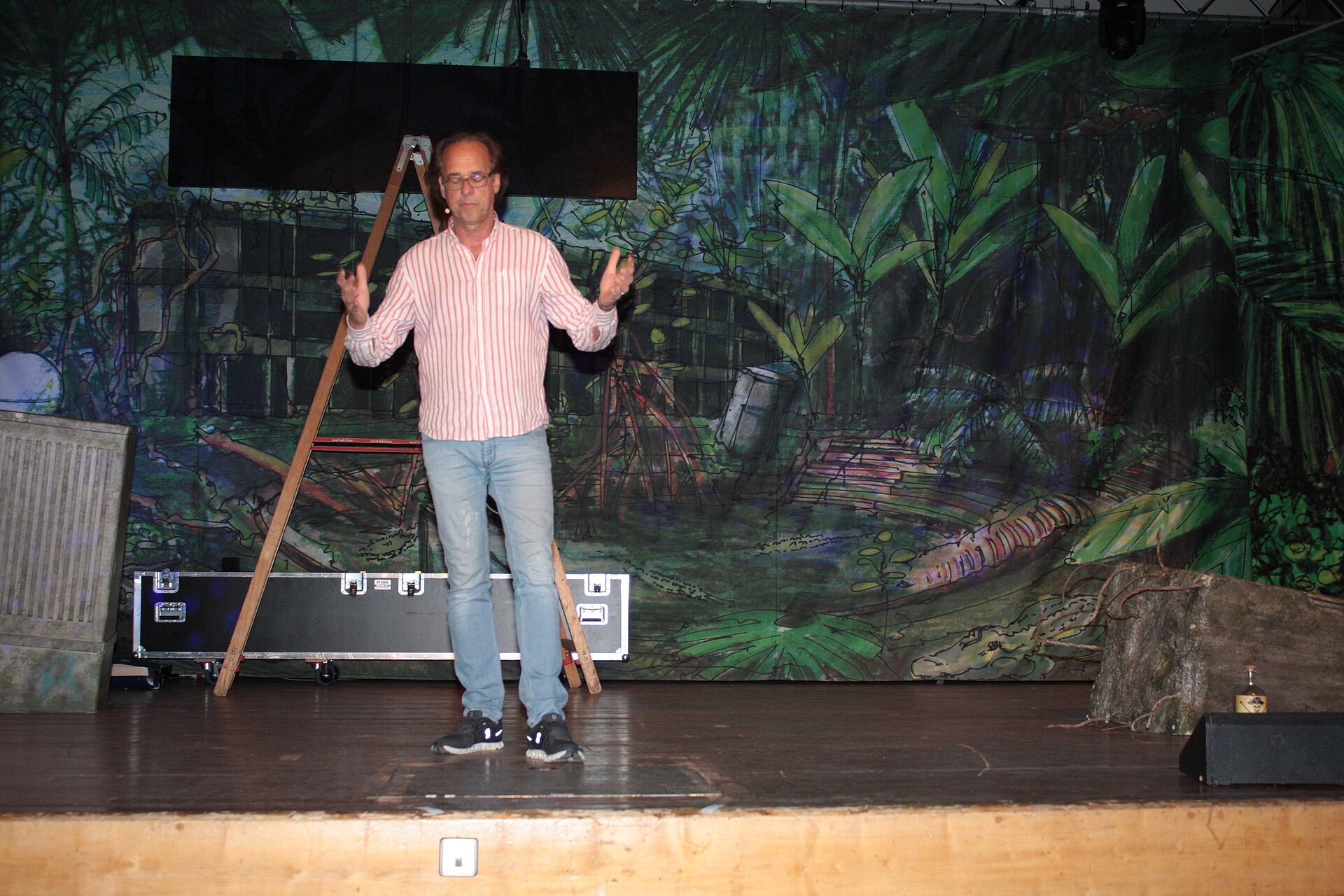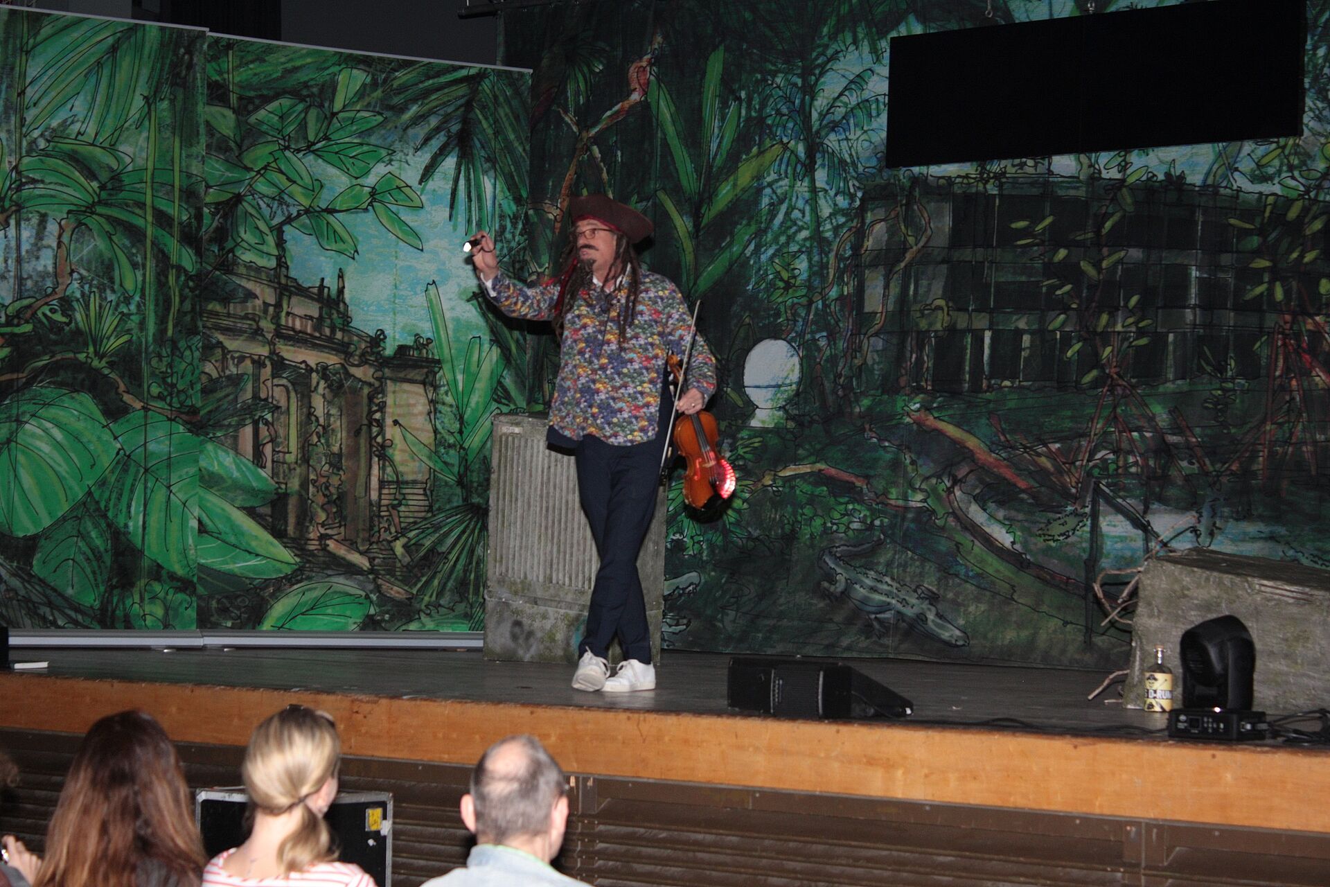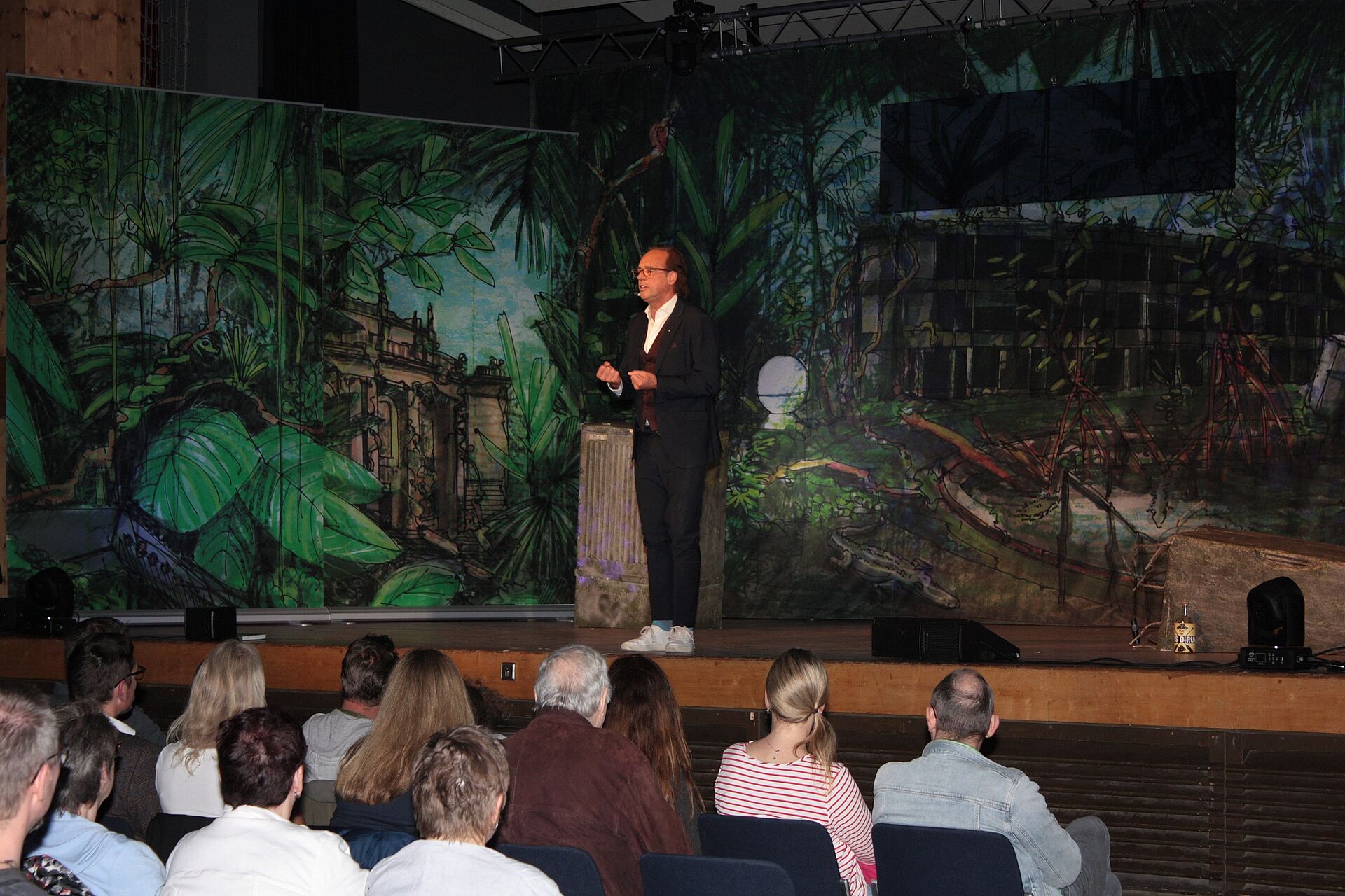 Er begrüßte das Publikum als "gespaltene Persönlichkeit" in verschiedenen Kostümen und Rollen und wies auf das aufwändig installierte Bühnenbild hin, das unsere Landeshauptstadt Stuttgart im Jahre 2054 zeigt - wie sich die Natur und der Klimawandel, die Metropole zurückgeholt haben!!